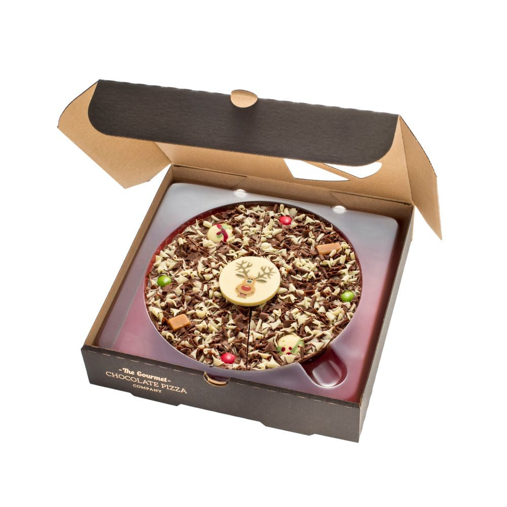 Gourmet Chocolates signature Belgian milk chocolate base with red and green chocolate drops, vanilla fudge pieces, mixed chocolate curls, and an adorable white chocolate reindeer plaque. This pizza makes a delicious gift for any chocolate lover, as well as a unique table centrepiece sure to keep any guests talking. Cut into 8 slices, we've made sure each pizza is ready to share - if you choose to, that is!