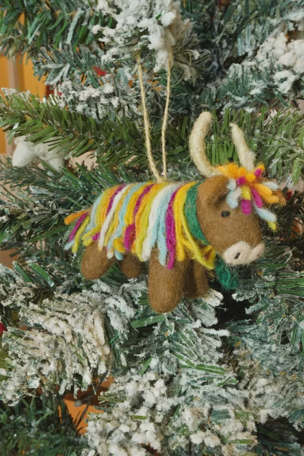 Regular price £6.71Pachamama hand felted colourful Hughie the Highland Cow Christmas tree ornament. Hanging decoration for your home. Festive farm animal friend. Felt decoration. 100% wool. Fair trade and hand crafted in Nepal.