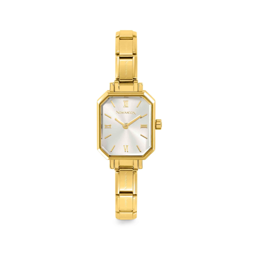 Discover this Time Collection watch, which is unique for its refinement and elegance. Made from strong hypoallergenic stainless steel with Yellow PVD finish. The case is rectangular with a Sunray Silver coloured dial. Time watches can be personalised with Composable® Links. This watch is both classic and timeless.