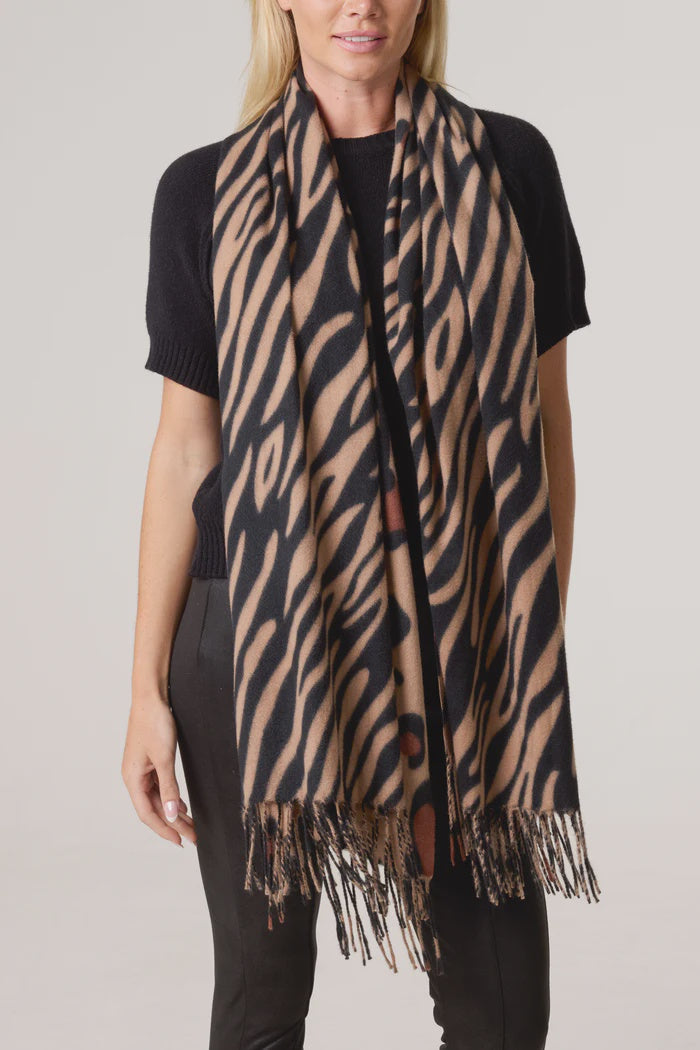 Zebra & Leopard Print Reversible Tassel Scarf - Brown